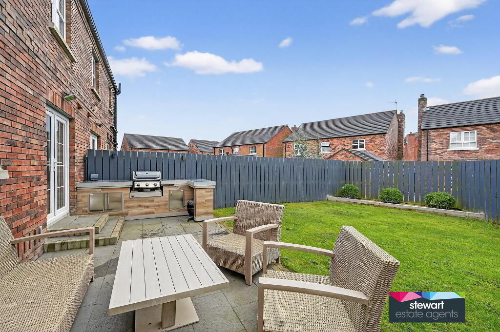 Neat gardens to the front and rear laid out in lawns with a feature patio with a barbeque area and space for a free standing barbeque