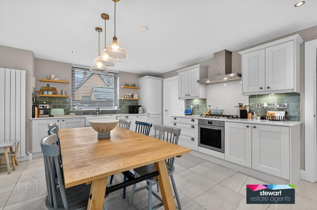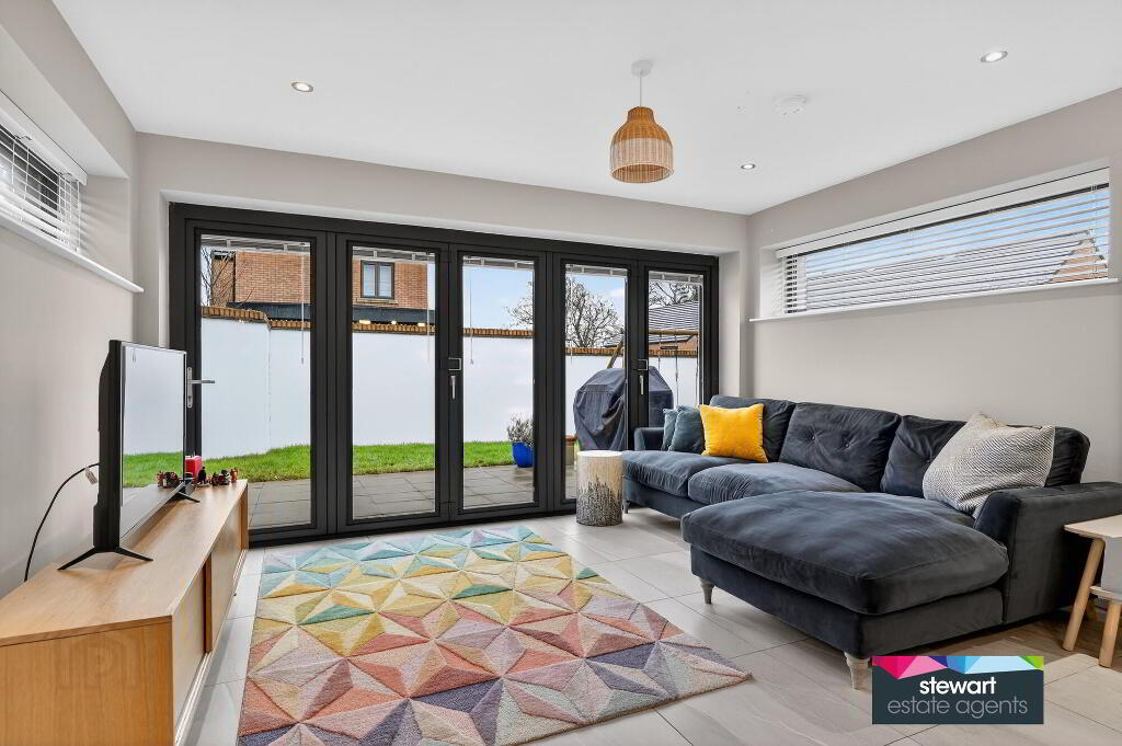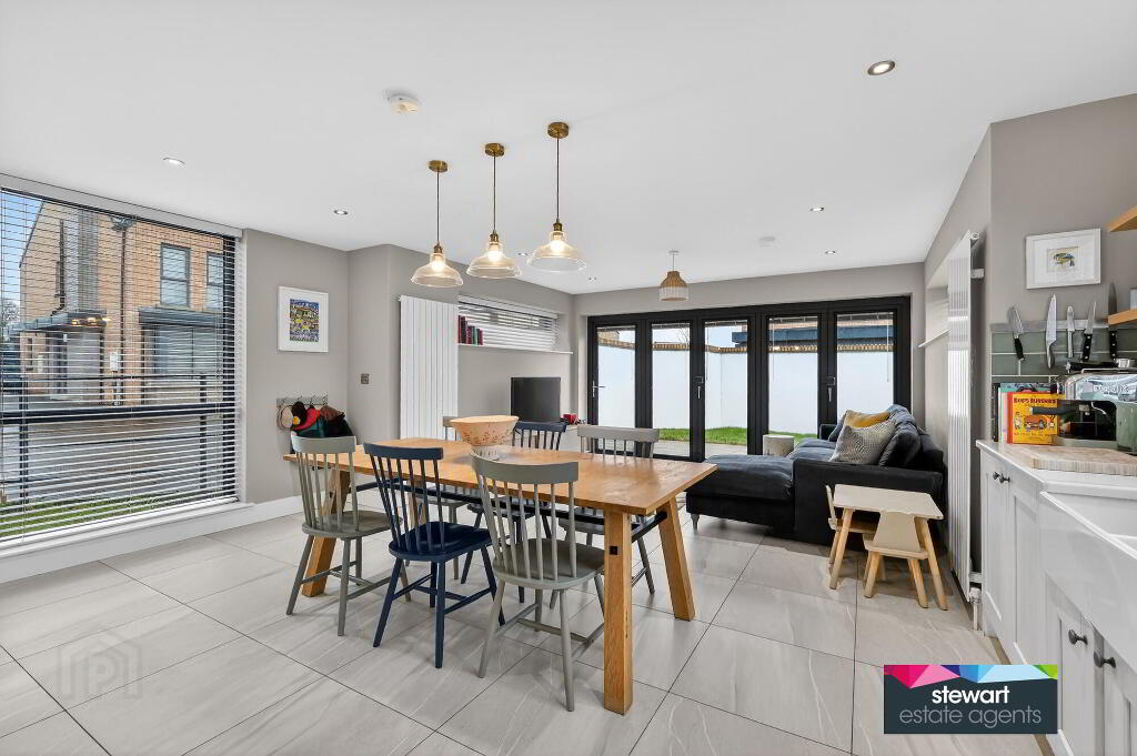 Stunning open plan kitchen with dining and family area with a contemporary style Bi fold patio doors to the garden and a feature high level window
