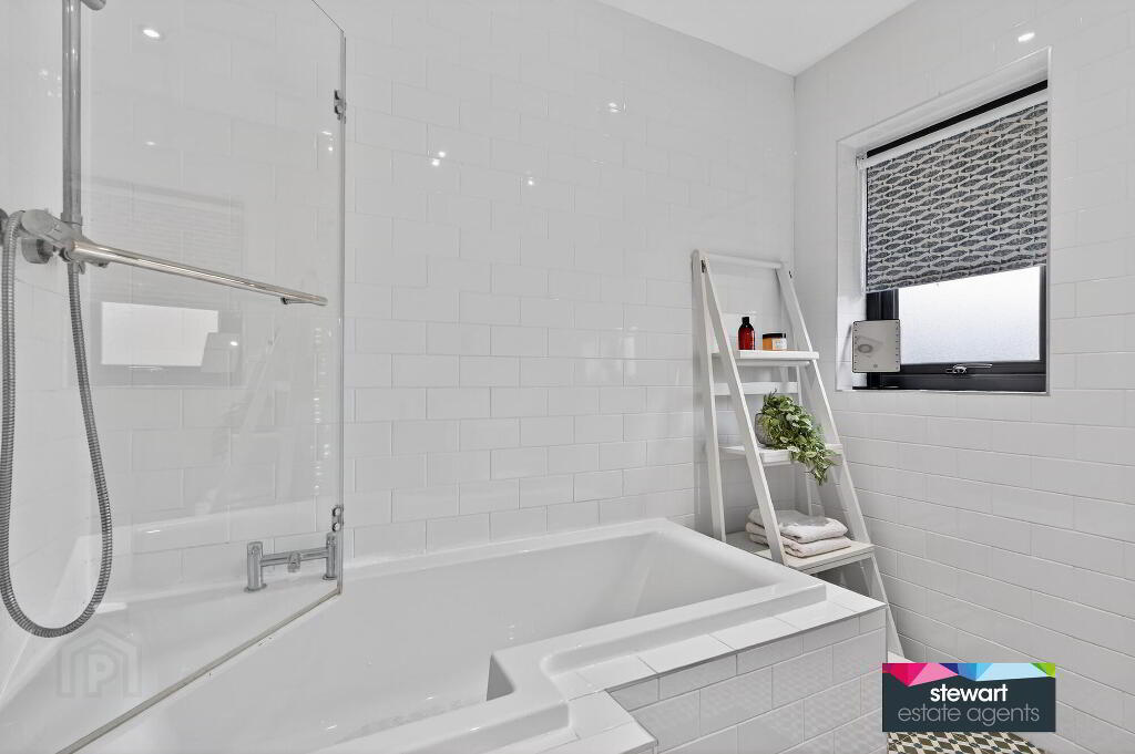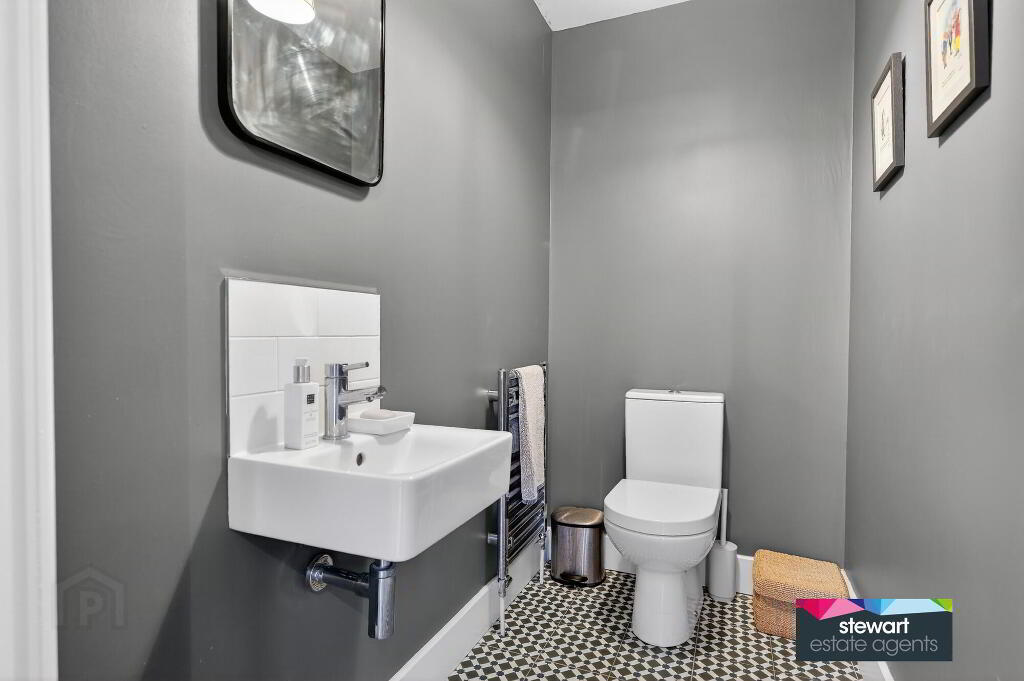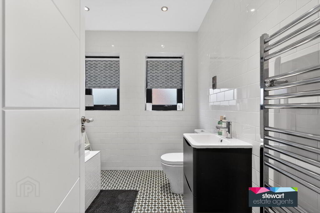 Bathroom on the first floor with a modern style suite including a bath, WC and vanity wash hand basin. Attractive tiled walls and feature tiled floor. Chrome towel rail
