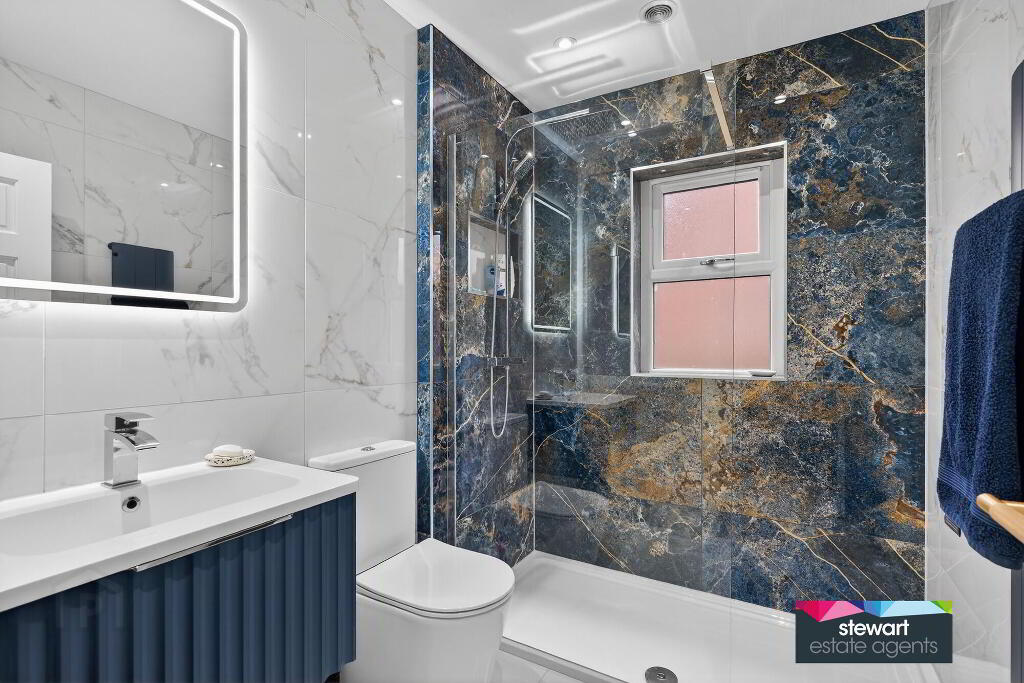 Beautifully renovated shower room with large shower cubicle, WC and wash hand basin