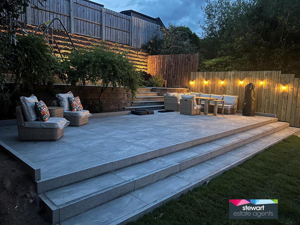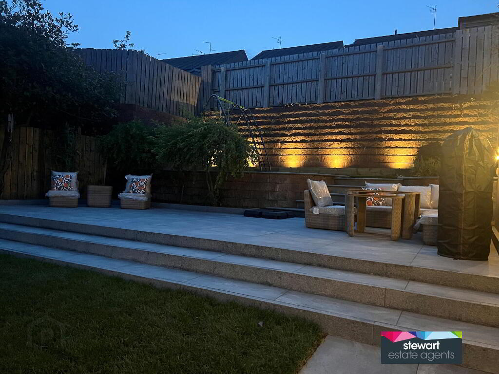 Gardens to the front and rear with feature rear garden laid out in lawns with newly laid patio area