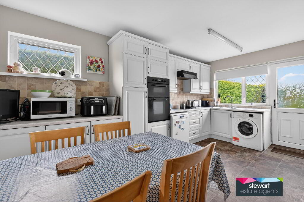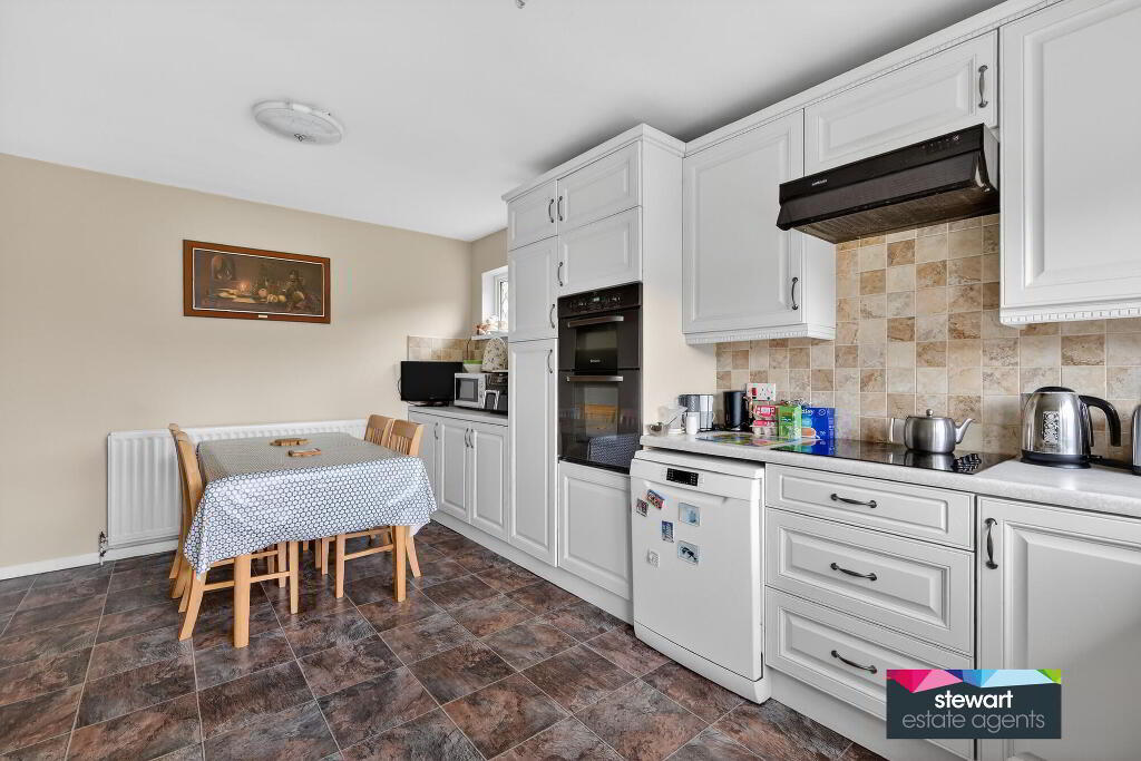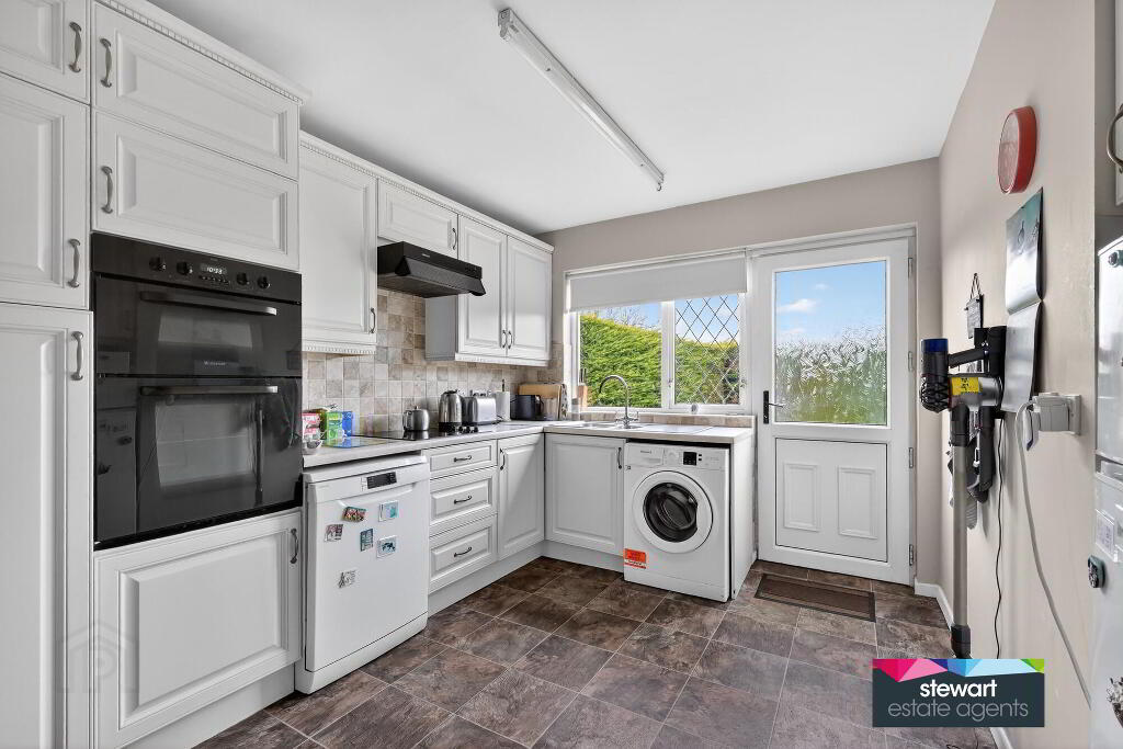 Beautifully fitted kitchen cabinetry with ample high and low level storage units including a built in double oven and inset hob. Space for a fridge. Space for a washing machine and space for a dish washer