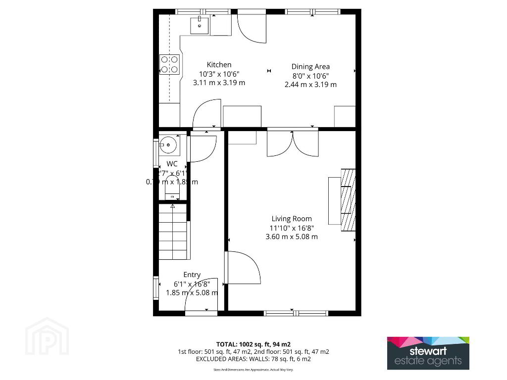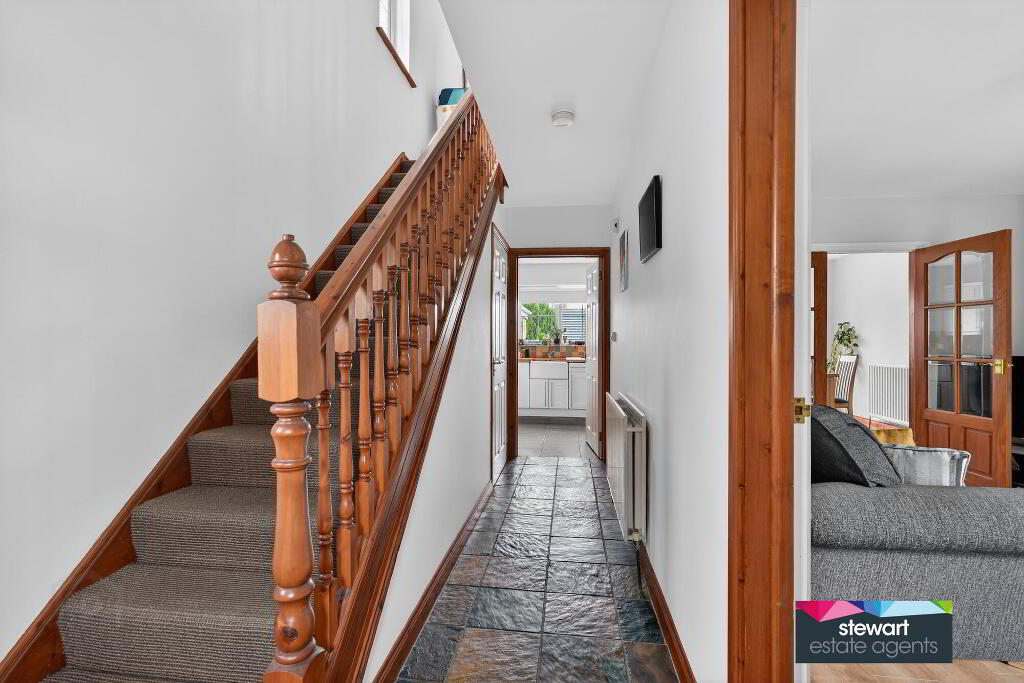 An attractive front door leading into the hallway with a spindled staircase to the first floor accommodation. Tiled floor