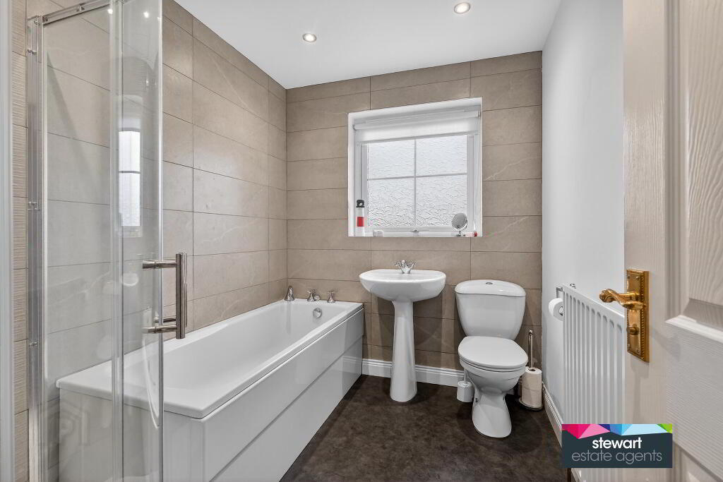 Bathroom with a modern and contemporary white suite including a bath, WC and wash hand basin. Separate shower cubical with a power shower fitment