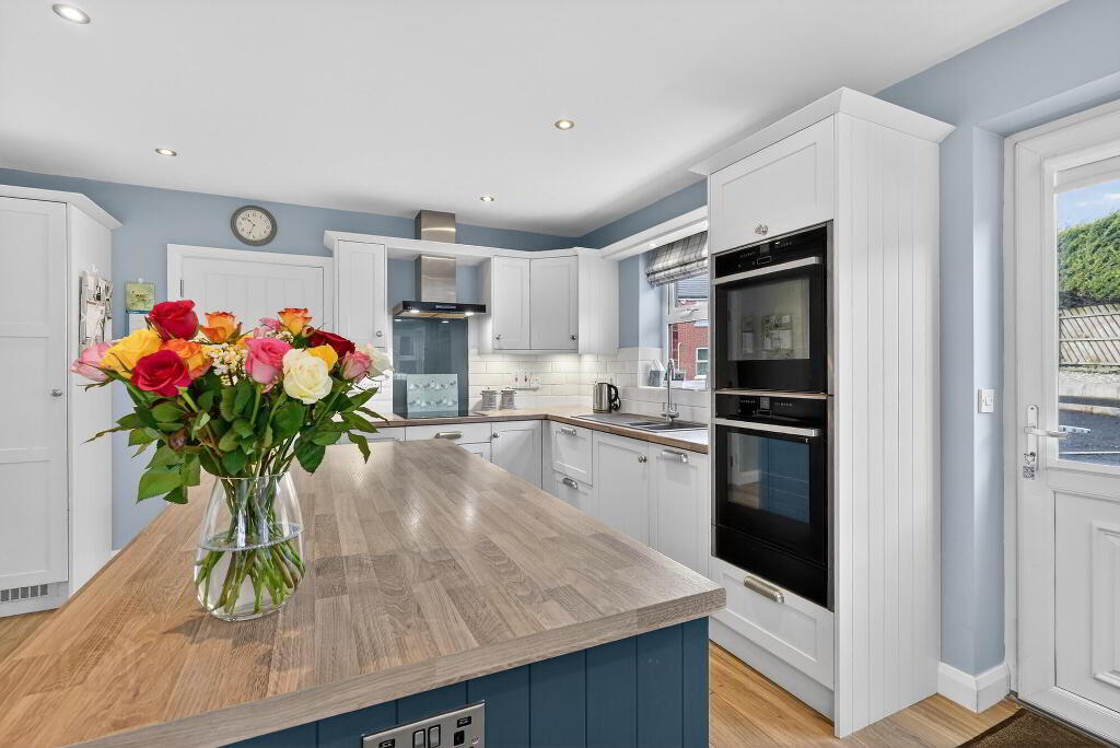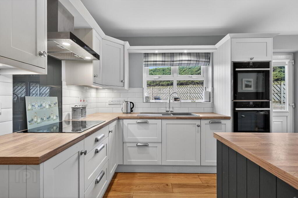 Bespoke fitted kitchen with an excellent range of contemporary style high and low level cupboards and a matching island unit. Built-in Neff ovens with slide-and-hide doors, warming drawer and inset induction hob. Built-in larder fridge and a built-in larder freezer