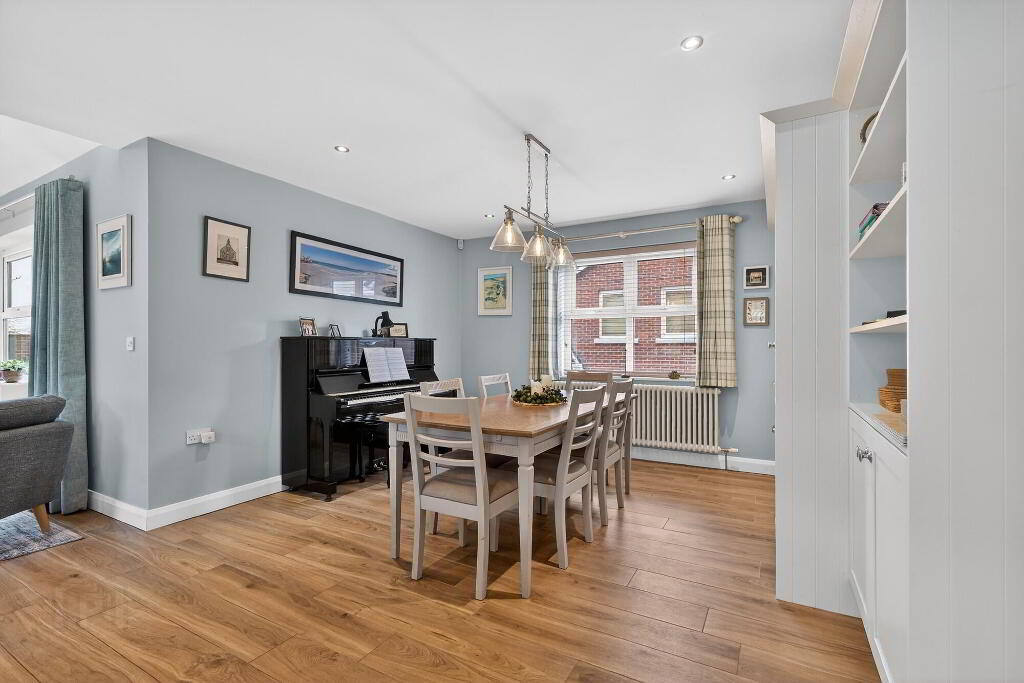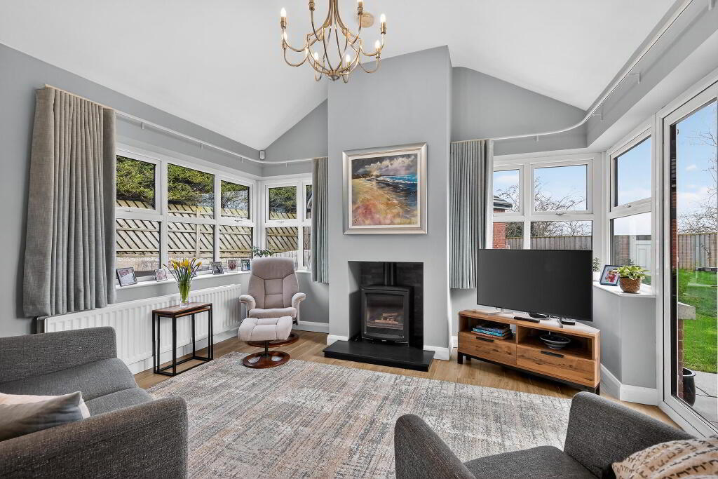 Stunning open plan kitchen with a spacious dining area and vaulted sun room / family area featuring a multi-fuel stove. Patio double doors leading to the rear garden