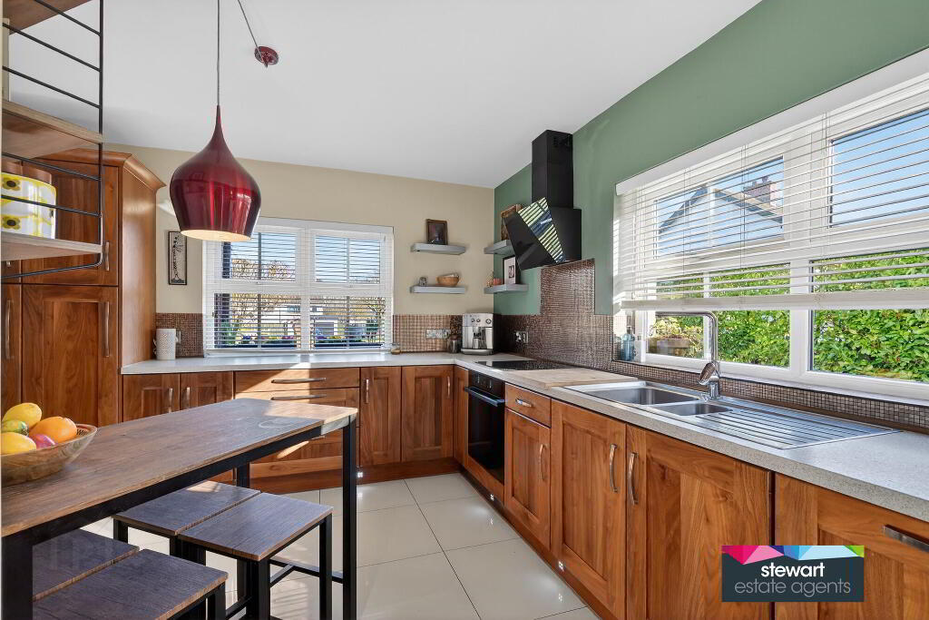 A beautifully fitted kitchen with a good range of storage cabinets including a modern style oven and inset hob with extractor fan above. Built in dishwasher.