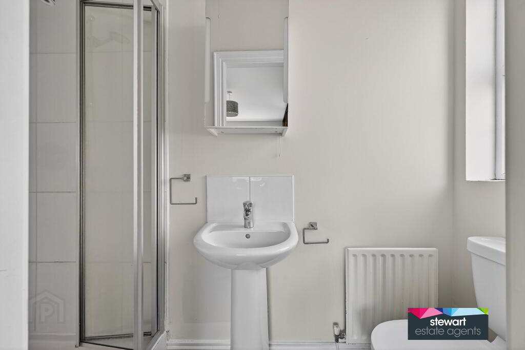 Bathroom on the first floor with a modern white suite including a bath, WC and wash hand basin, separate shower cubicle with shower fitment