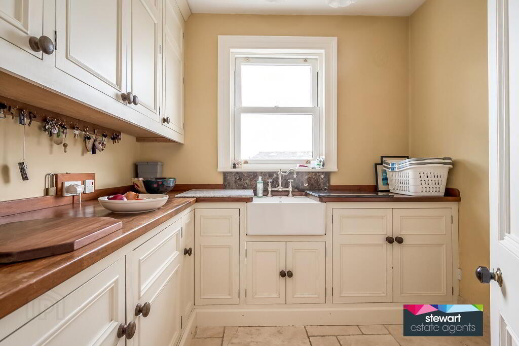 Separate utility room with bespoke fitted high and low level cabinetry and an inset Belfast sink unit