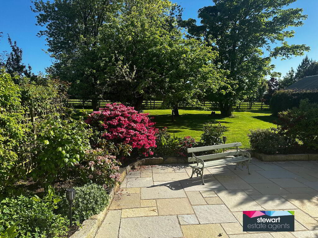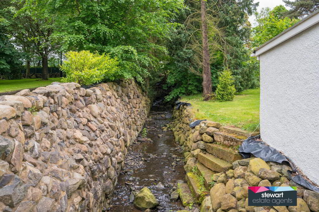 Stunning gardens with a babbling brook and stone feature, an array of mature evergreen and deciduous trees as well as fruit trees, buxus hedging, floral borders and coach lights