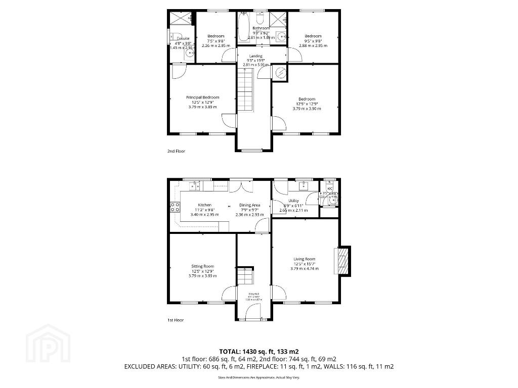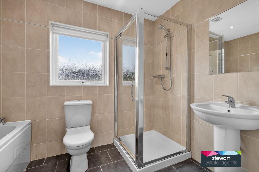 Bathroom on the first floor with a modern suite including a bath, WC and wash hand basin as well as a separate shower cubicle. Fully tiled walls