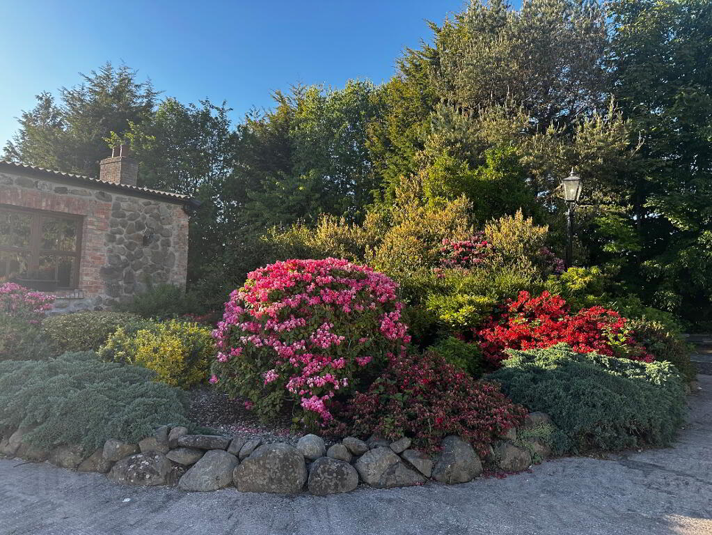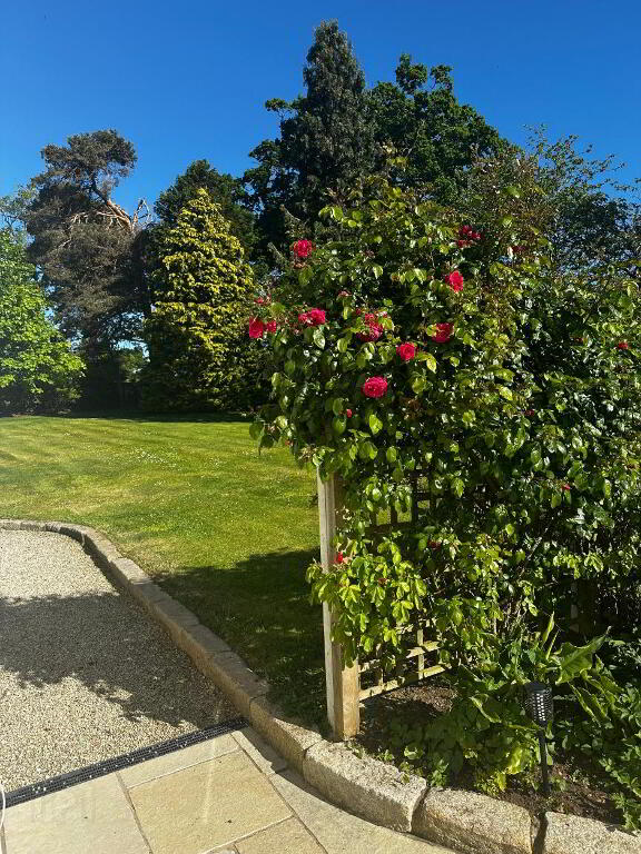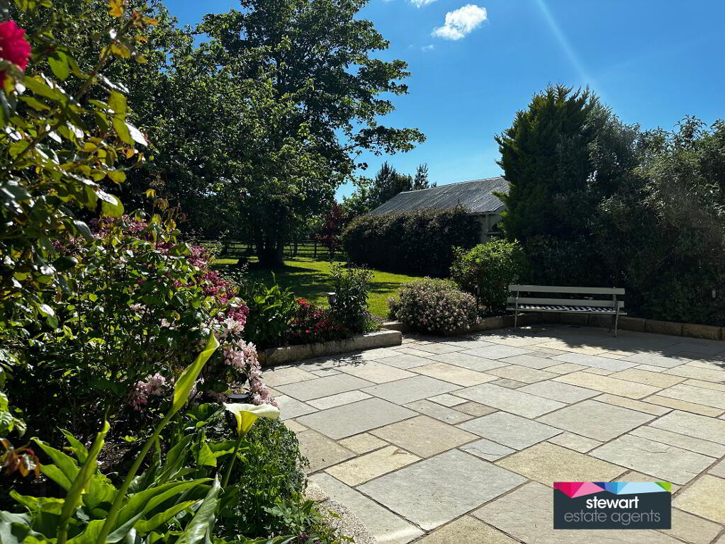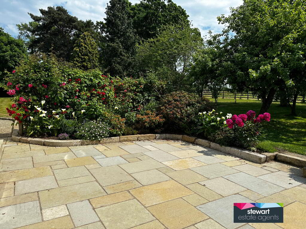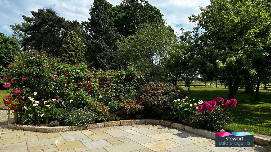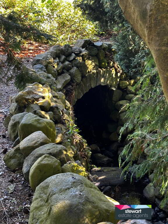 Stunning gardens with a babbling brook and stone feature, an array of mature evergreen and deciduous trees as well as fruit trees, buxus hedging, floral borders and coach lights