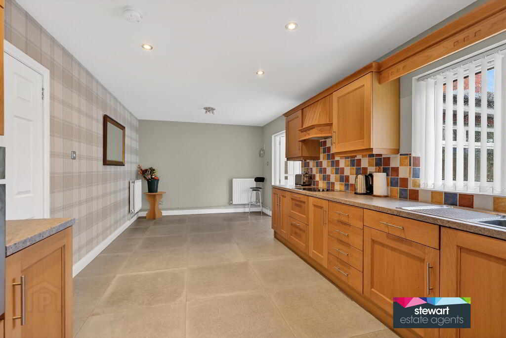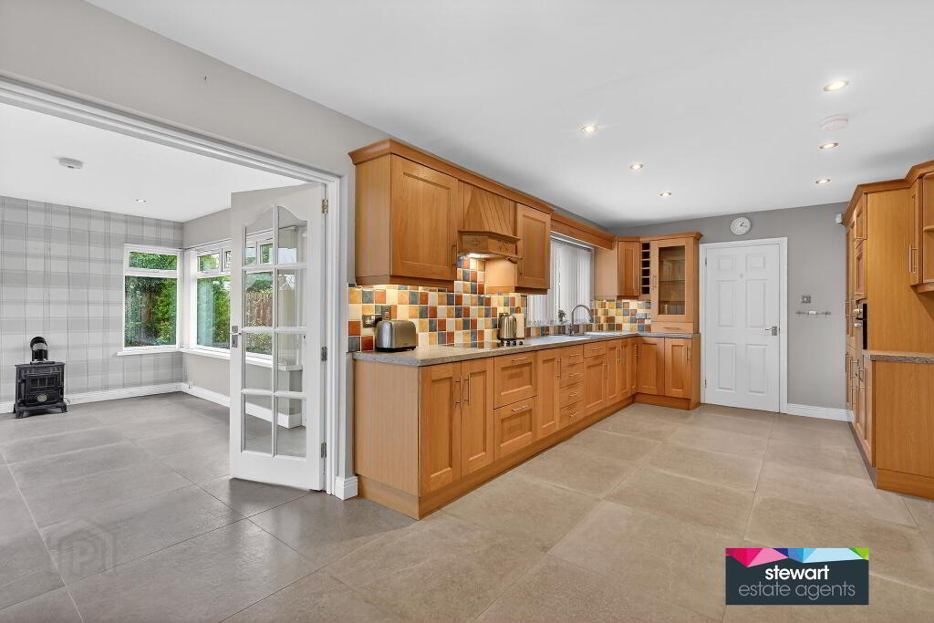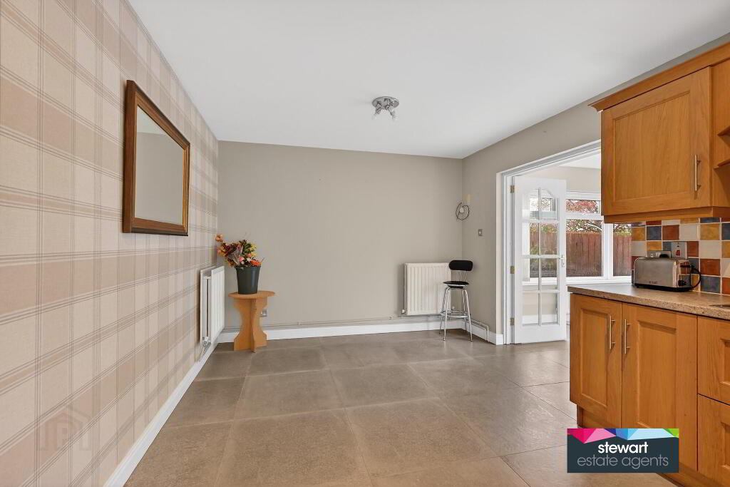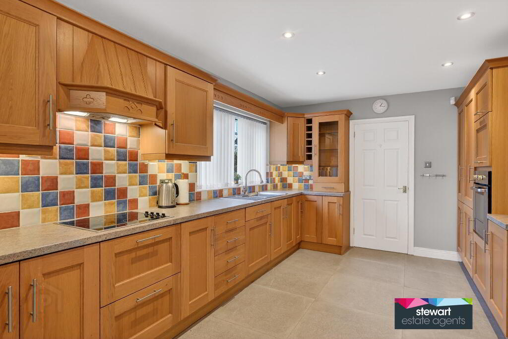 Beautifully fitted kitchen with ample high and low level cabinetry finished with good quality oak style panelled doors and providing ample storage units. Built in oven and a separate inset hob with extractor fan above. Feature tiled floor. Partially tiled walls