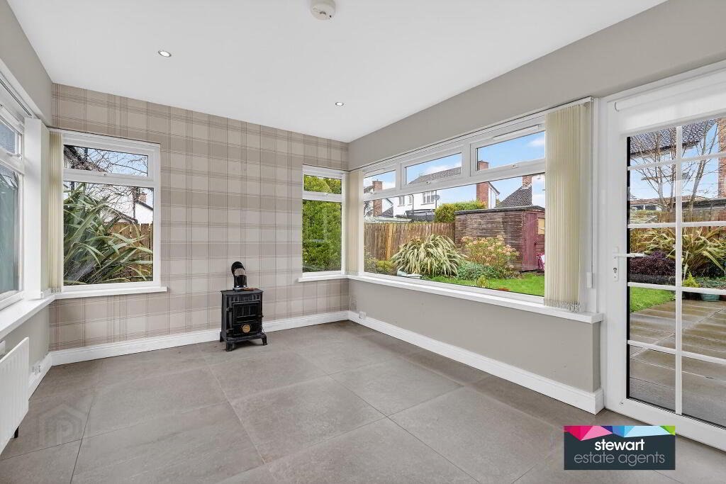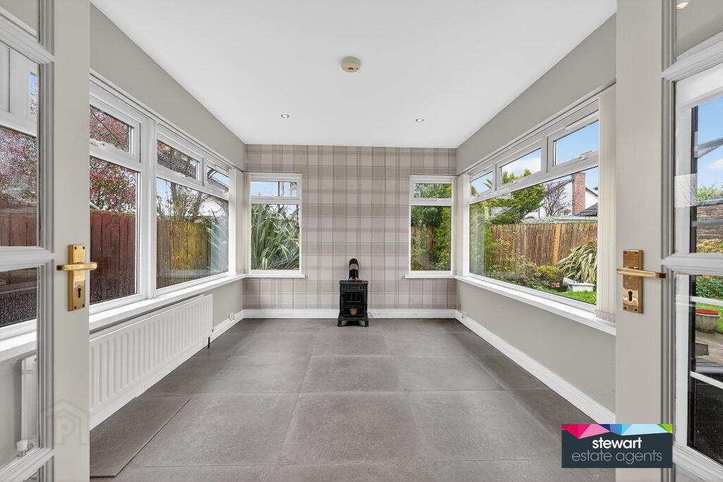 A very attractive sun room to the rear with a cast iron stove and a PVC double glazed door to the rear patio