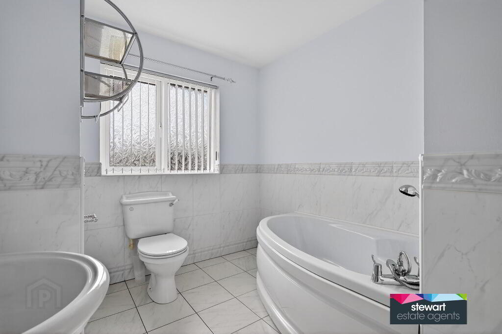 Bathroom on the first floor with a modern style suite including a corner bath, WC and wash hand basin. Partially tiled walls and tiled floor