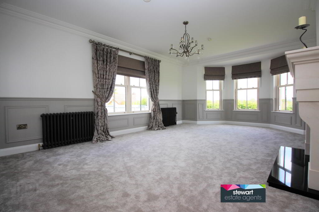 Elegant drawing room with feature bay window and impressive sandstone fireplace and low level wall panelling