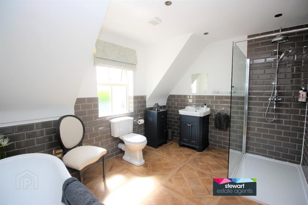 Stunning bathroom with feature slipper bath, WC and wash hand basin and a walk in shower and feature wall tiles